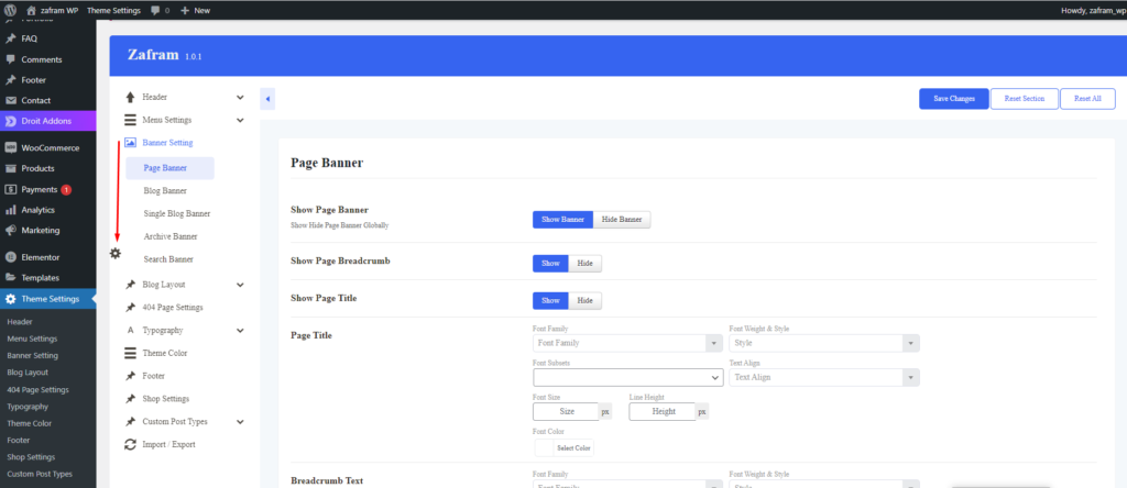 From this Banner Settings option, you have the option to customize banner options from Page Banner, Blog Banner, Single Blog Banner, Archive Banner, Search Banner & 404 Banner with customized banner images, show/hide banner toggle, show/hide title, show/hide breadcrumb, & banner color overlay.
