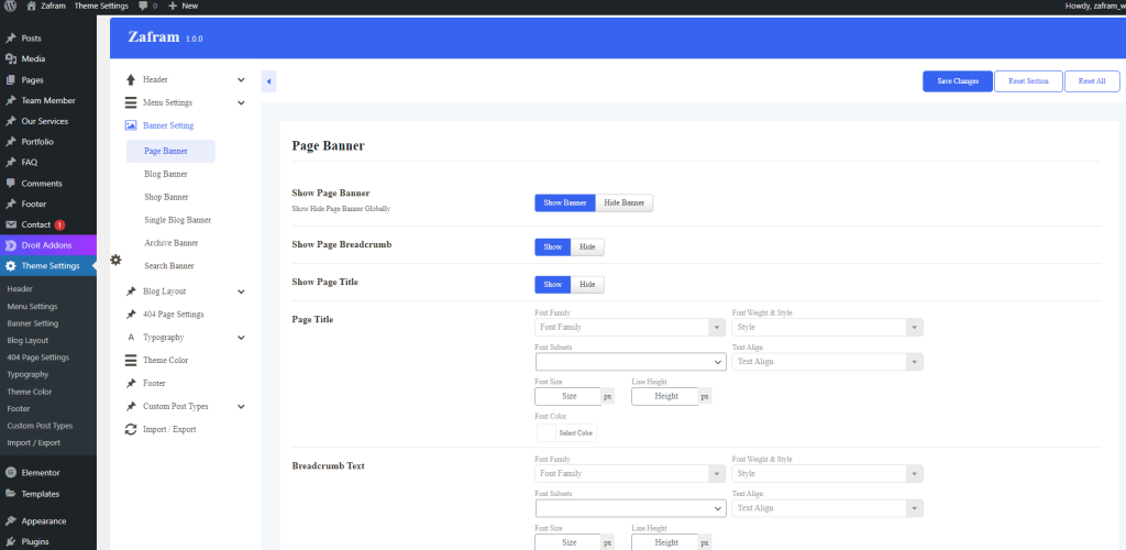 From this Banner Settings option, you have the option to customize banner options from Page Banner, Blog Banner, Single Blog Banner, Archive Banner, Search Banner & 404 Banner with customized banner images, show/hide banner toggle, show/hide title, show/hide breadcrumb, & banner color overlay.
