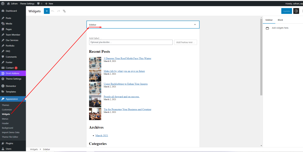 For Example for the overall site sidebar in the first step, you need to add some widgets inside your Primary Sidebar area. The primary sidebar area widgets will show on the blog sidebar; like the below shot: